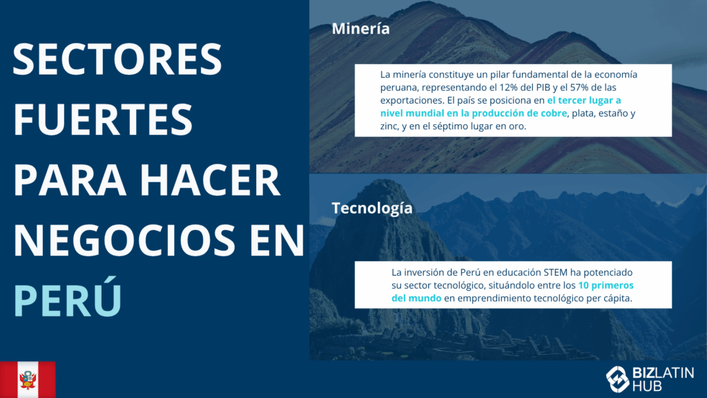Sectores más importantes en Perú | Históricamente, la minería siempre ha sido uno de los sectores más fuertes de la economía peruana. Sin embargo, los servicios, especialmente la tecnología, están ganando importancia rápidamente. |