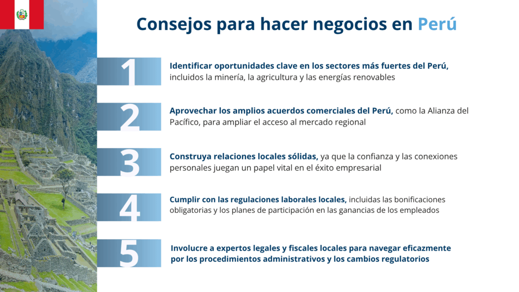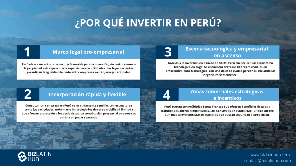 Recientemente, también se han aprobado leyes que facilitan la inversión extranjera y garantizan que las empresas extranjeras y locales reciban el mismo trato. Además, constituir una empresa en Perú es un proceso relativamente sencillo. Merece la pena explorar todas estas condiciones altamente competitivas para aprovechar al máximo lo que ofrece esta nación en crecimiento.
