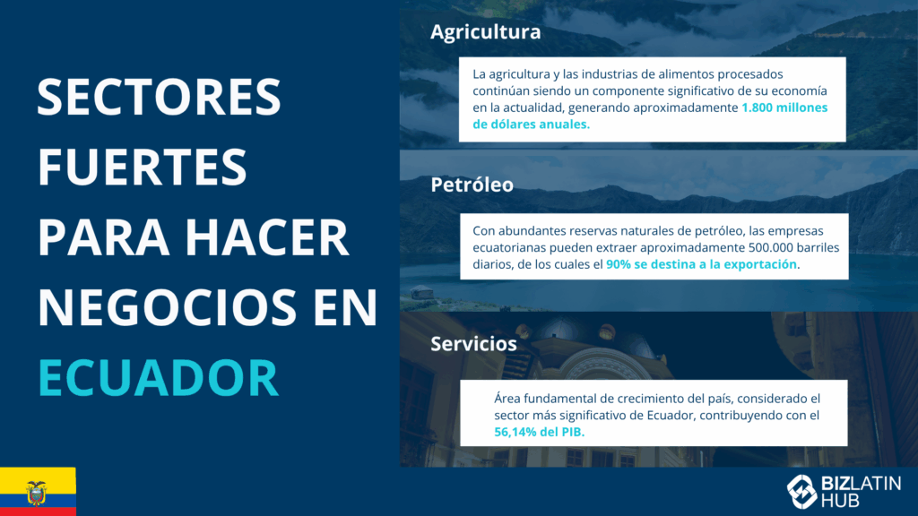 Sectores más importantes en Ecuador | La agricultura sigue siendo hoy una parte importante de su economía, generando unos 1.800 millones de dólares anuales, pero la inversión extranjera y la diversificación han fomentado nuevos negocios. El desarrollo de nuevas tecnologías y el continuo impulso para combinar la innovación con la sostenibilidad han generado oportunidades en el sector del petróleo. |