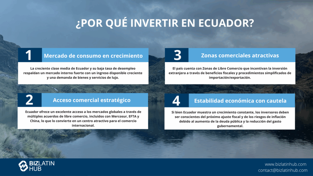 Si quieres expandir tu negocio globalmente y encontrar nuevas oportunidades en los mercados de toda América Latina, entonces Ecuador debería ser un país a tener en cuenta. De hecho, con su economía fuerte y estable, su abanico de oportunidades de mercado y sus bajas barreras de entrada, nunca ha habido mejor momento para poner un pie en la nación y causar sensación con tu negocio.
