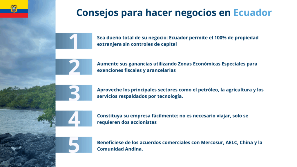 - Las empresas constituidas en Ecuador pueden ser 100% de propiedad extranjera.