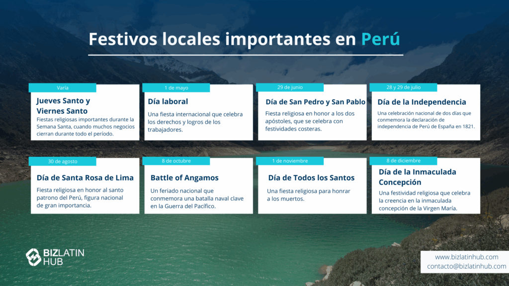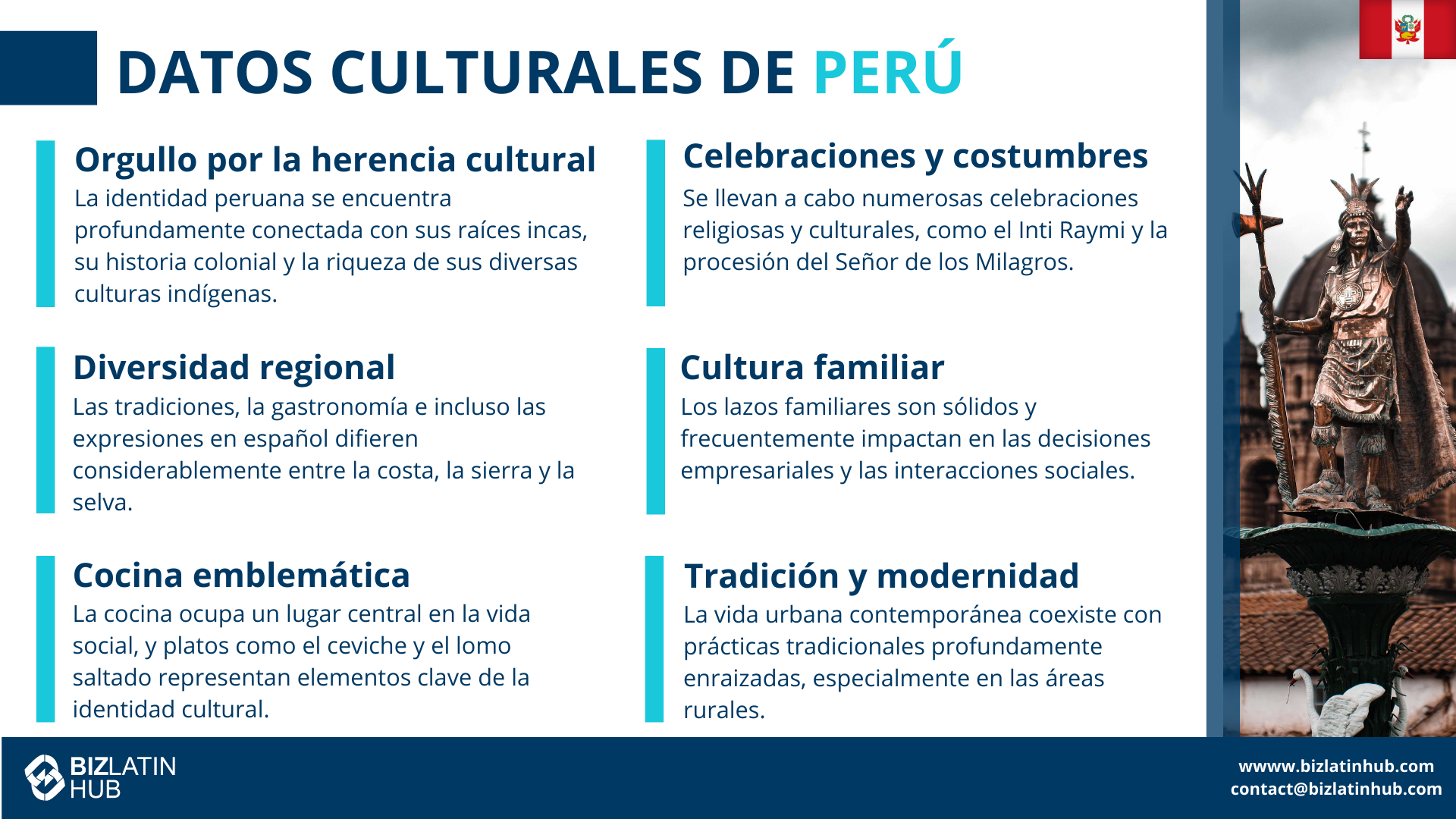 Aunque esta guía es una excelente introducción a la cultura empresarial peruana, siempre es mejor trabajar con un socio local que conozca bien la cultura empresarial y las costumbres del país.