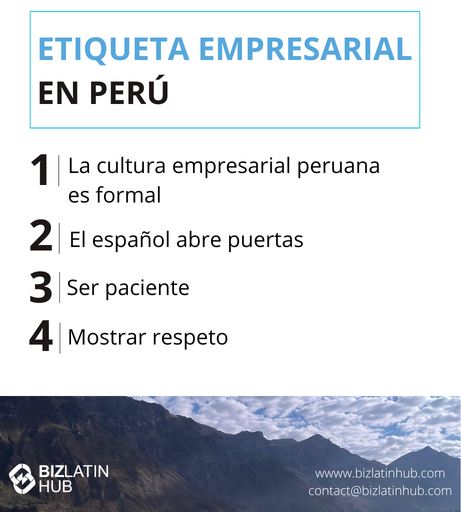 ¿Qué importancia tiene la puntualidad en la cultura empresarial peruana? | Ignora los estereotipos y asegúrate de hacer las cosas a tiempo para causar una buena impresión. |