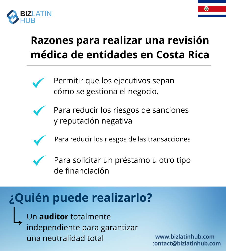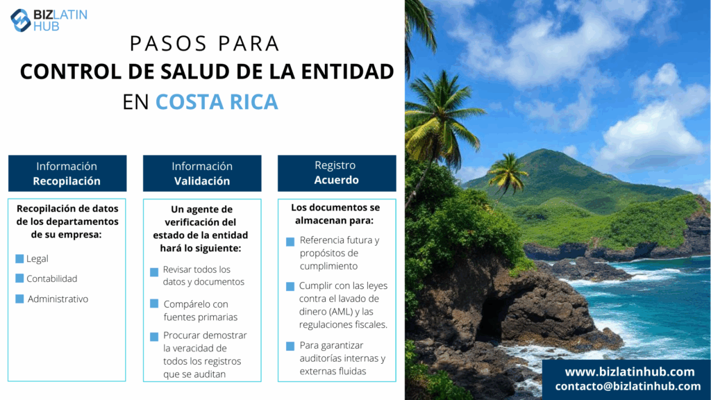 Un chequeo de la salud de la entidad en Costa Rica incluye una revisión legal y contable exhaustiva para determinar si una empresa cumple todas las normas y reglamentos locales, y verificar que los registros contables son exactos. Un chequeo de la salud de la entidad puede incluir el examen de distintos documentos societarios, como declaraciones fiscales, declaraciones de sociedades o licencias de funcionamiento.