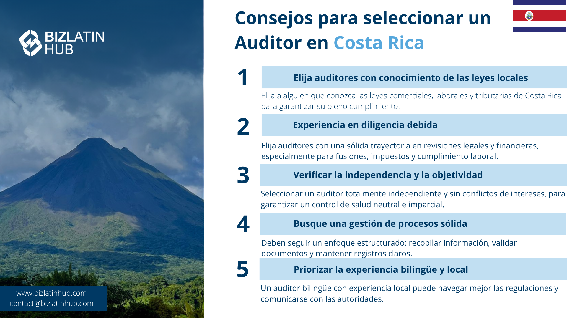 Además de emprender esa diligencia debida antes de hacer un negocio en Costa Rica, también puedes realizar una autoverificación. Una medida de este tipo es especialmente útil si tu empresa ha experimentado un descenso de la productividad o de los beneficios, pero puede llevarse a cabo simplemente para verificar que todo funciona correctamente e identificar y eliminar posibles riesgos futuros que puedan llegar a afectar a las operaciones de tu empresa.