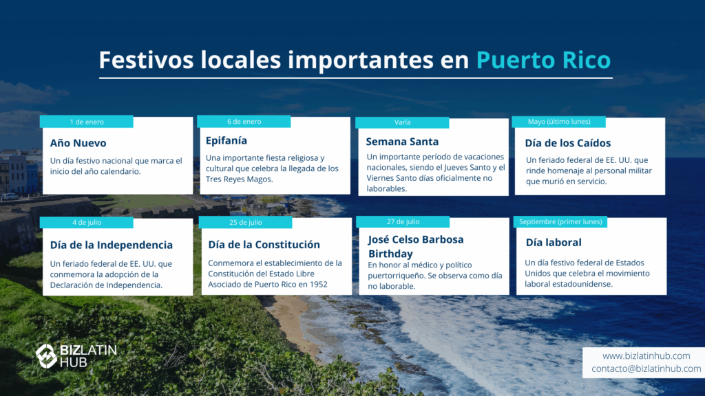 En Puerto Rico se celebran 16 días festivos y se conceden 15 días de vacaciones, incluidos los permisos por acontecimientos personales como cumpleaños y comparecencias ante los tribunales. Las empresas deben tener en cuenta estos días en sus calendarios.