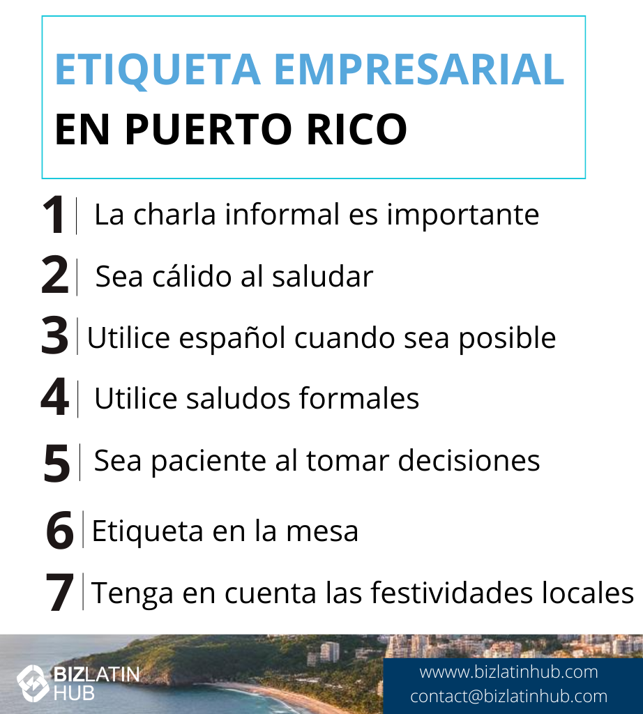 Este artículo explora los aspectos esenciales de la etiqueta empresarial puertorriqueña. Desde los estilos de comunicación hasta las costumbres culinarias, cada sección ofrece ideas para ayudarte a navegar por los matices de este paisaje empresarial único. Prepárate para sumergirte en una visión global que te prepare para interacciones significativas en Puerto Rico.