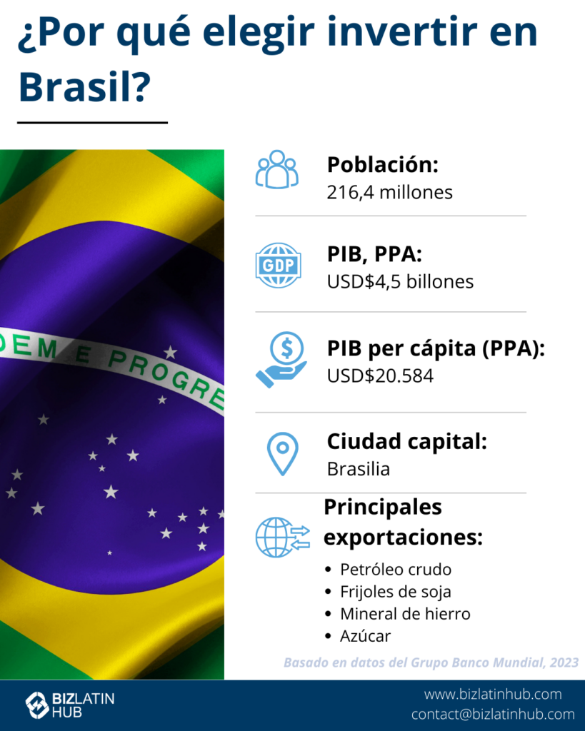 ¿Por qué invertir en Brasil? | Brasil sigue liderando como la mayor economía de América Latina, con sectores en crecimiento en agricultura, energía, tecnología y manufactura. |