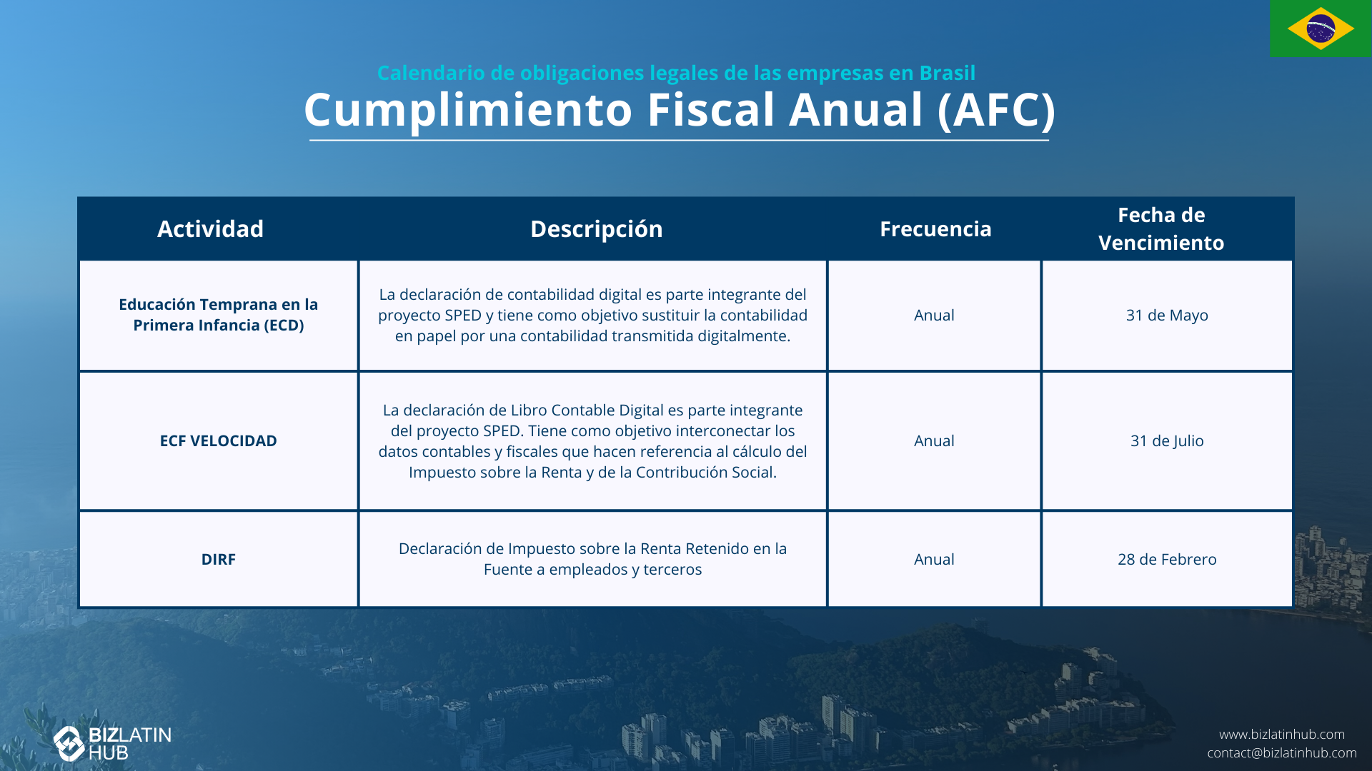 SPED ECD se refiere a la Contabilidad Digital, SPED ECF es la Contabilidad Fiscal Digital, y DIRF es la Declaración de Retención del Impuesto sobre la Renta. Todas ellas son declaraciones anuales obligatorias para las empresas brasileñas.