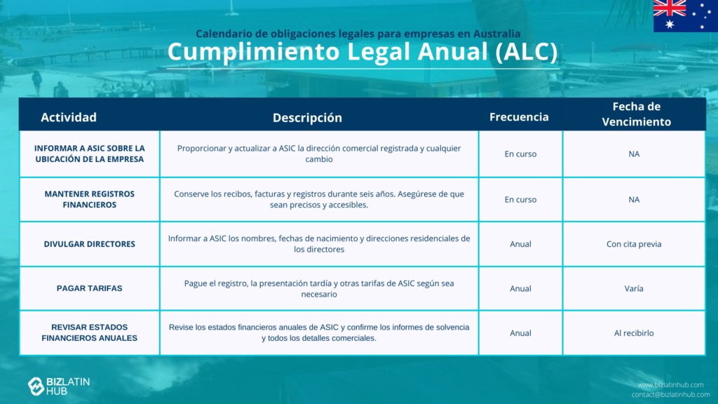¿Cuáles son los requisitos anuales de cumplimiento legal de la entidad? | Algunos de los principales requisitos de cumplimiento legal para una empresa en Australia son los siguientes: Informar a la ASIC de un centro de actividad principal Mantener todos los registros financieros Dar a conocer a tus directores Pagar las tasas Mantener la información actualizada |