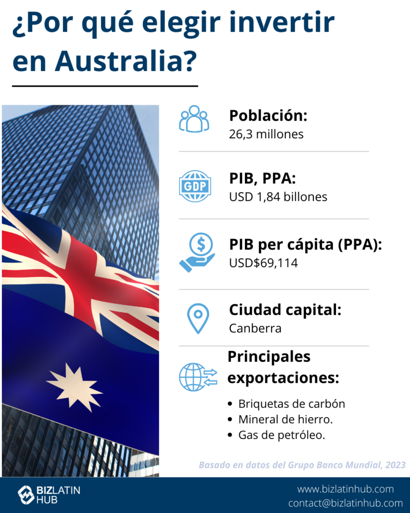 ¿Por qué invertir en Australia? | Invertir en Australia ofrece un crecimiento económico constante, una mano de obra altamente cualificada, una ubicación estratégica, una sólida gobernanza y unas infraestructuras de categoría mundial. |