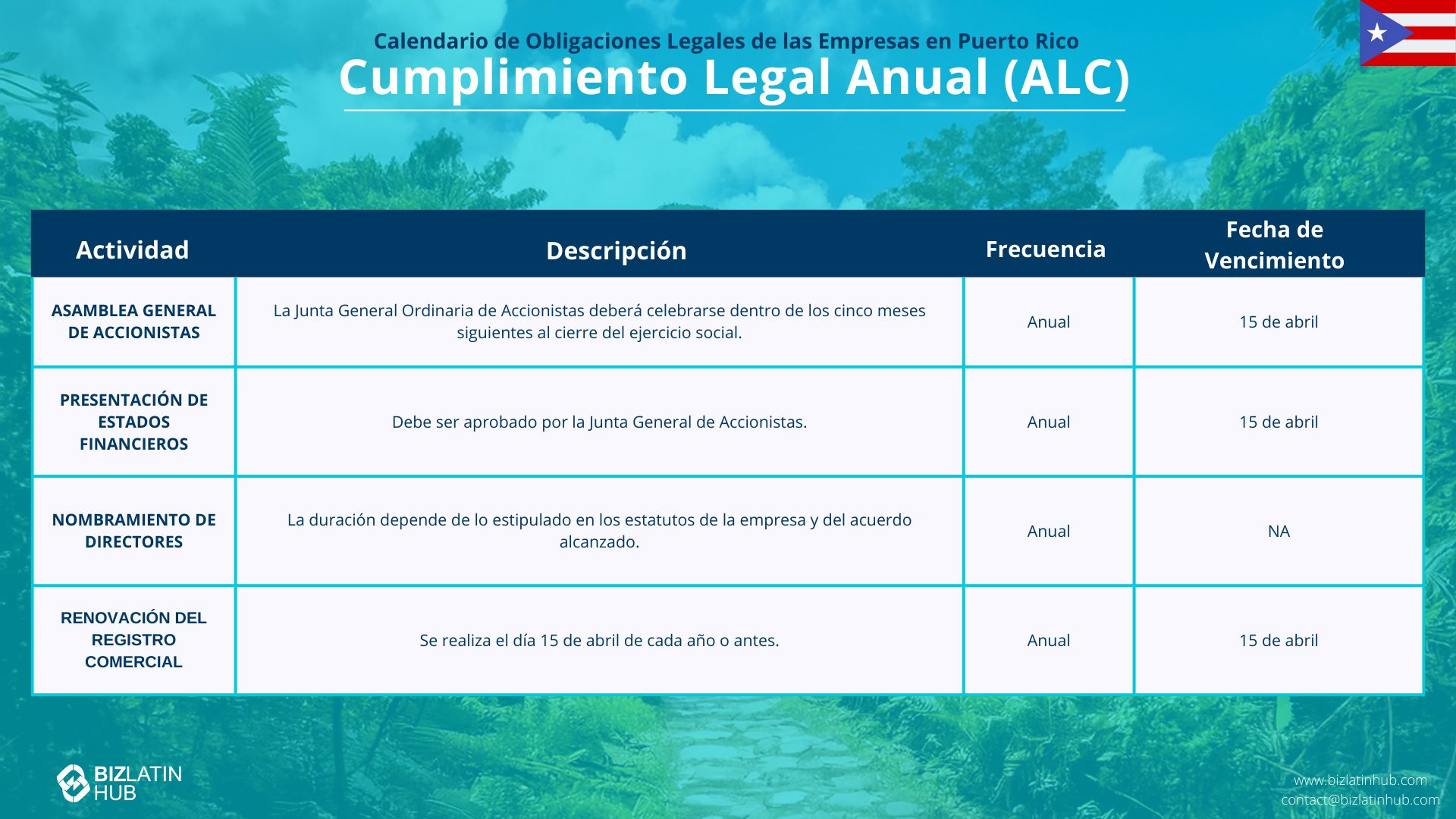 ¿Cuáles son los requisitos anuales de cumplimiento legal de la Entidad? | La junta general ordinaria de accionistas debe celebrarse dentro de los cinco meses siguientes al cierre del ejercicio fiscal y antes de la fecha límite del 15 de abril en Puerto Rico. |
