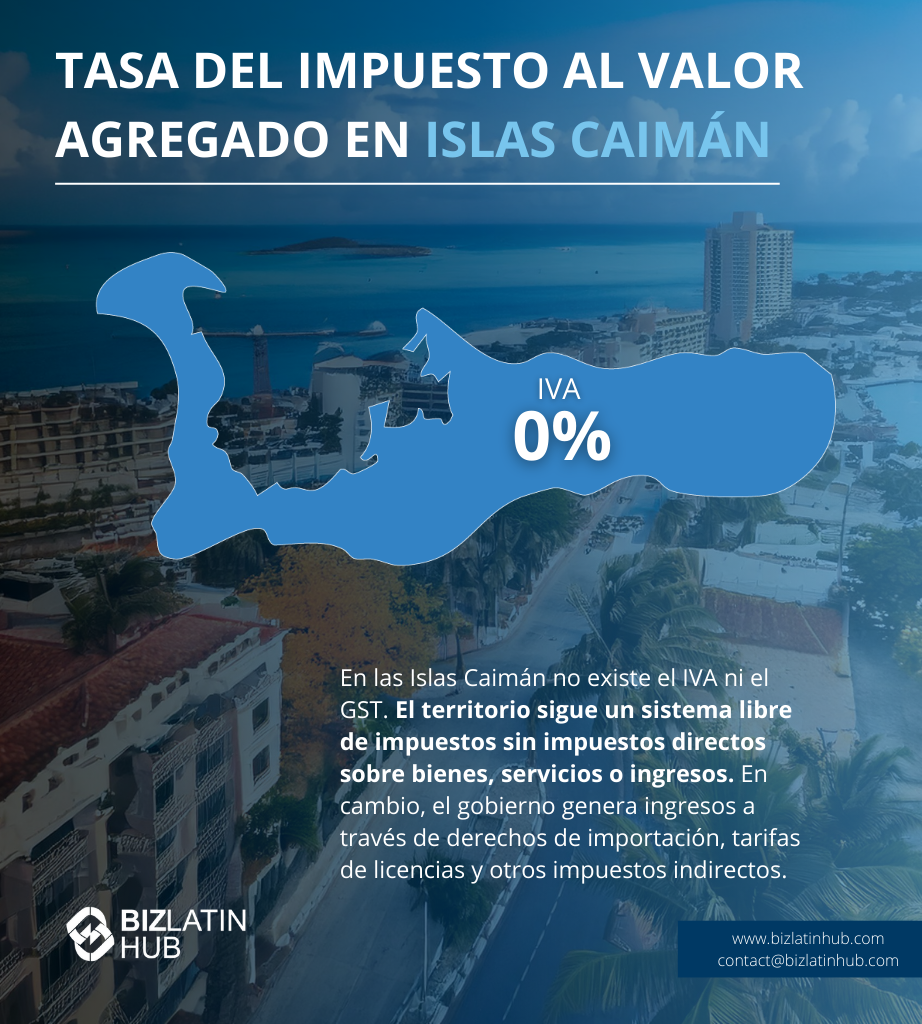 ¿Cuál es el tipo del Impuesto sobre el Valor Añadido en las Islas Caimán? | A diferencia de algunos países, las Islas Caimán no tienen un Impuesto sobre el Valor Añadido (IVA) o impuesto equivalente, lo que facilita a las empresas la gestión de sus operaciones financieras. |