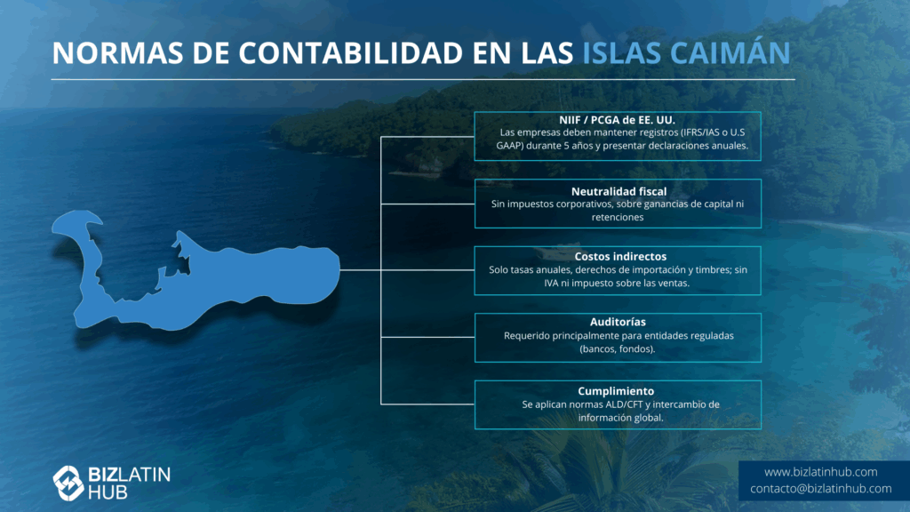 Como en muchas partes del mundo, las empresas que operan en las Islas Caimán deben cumplir las Normas Internacionales de Información Financiera (NIIF), también conocidas como Normas Internacionales de Contabilidad (NIC).