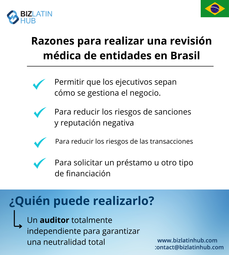 Un chequeo de la salud de la entidad revisa las obligaciones fiscales, las contribuciones a la seguridad social, el cumplimiento de la legislación laboral, la gobernanza corporativa, los contratos con terceros y los requisitos de presentación digital a través del sistema SPED de Brasil.