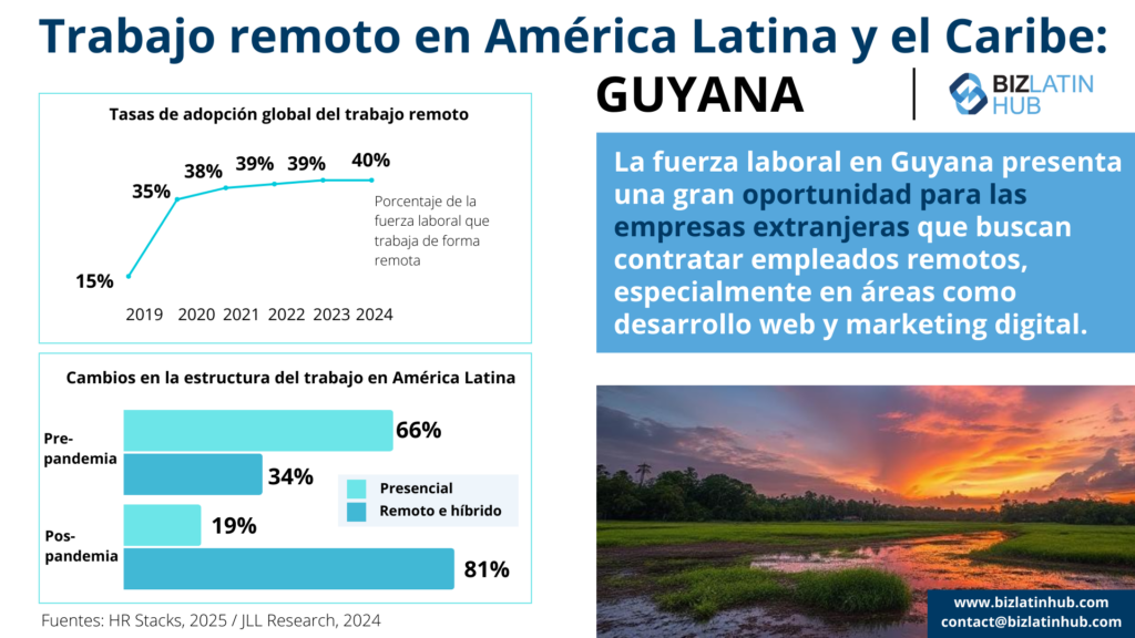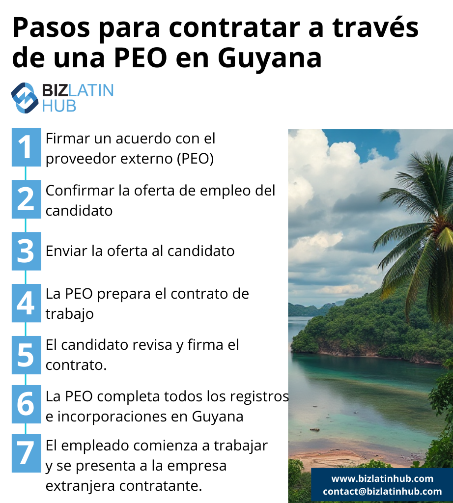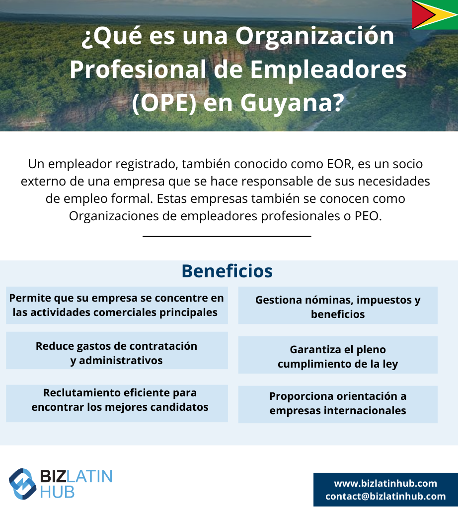 Consejo importante: Aunque un EOR proporciona una solución de entrada rápida, establecer una entidad jurídica y trabajar con un OEP suele ofrecer un mayor control, eficiencia de costes a largo plazo, menor riesgo de establecimiento permanente, una posición jurídica más sólida y una mejor atracción de talentos en Guyana. Biz Latin Hub ofrece soluciones tanto en OEP como en EOR, ayudando a las empresas a navegar por la normativa de Guyana, establecer entidades y garantizar el pleno cumplimiento de los derechos humanos. Tanto si necesitas una entrada rápida en el mercado como una presencia estable a largo plazo, podemos guiarte en el proceso.