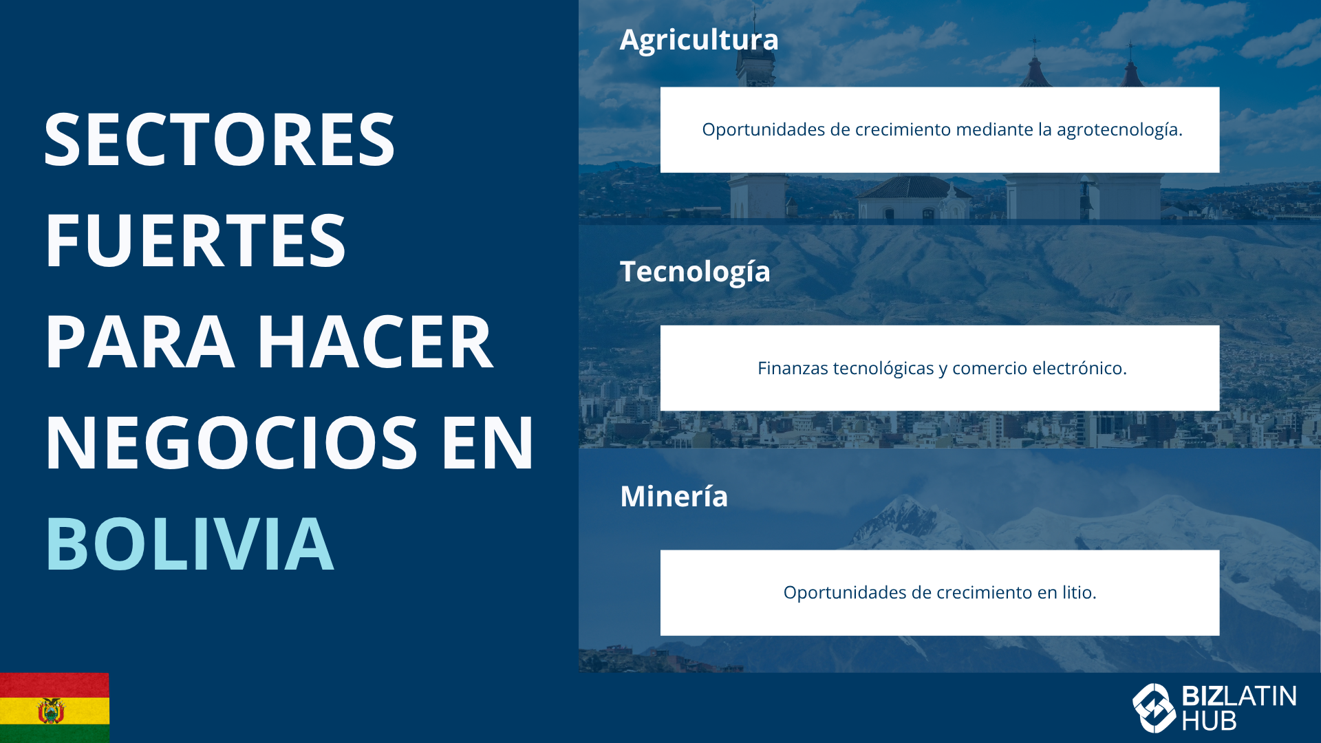 Sectores fuertes en Bolivia | La agricultura sigue siendo fuerte y tiene oportunidades de desarrollo a través de la agrotecnología. La tecnología está empezando a crecer, especialmente la fintech y el comercio electrónico. La minería es fuerte, con oportunidades de expansión en el litio. |