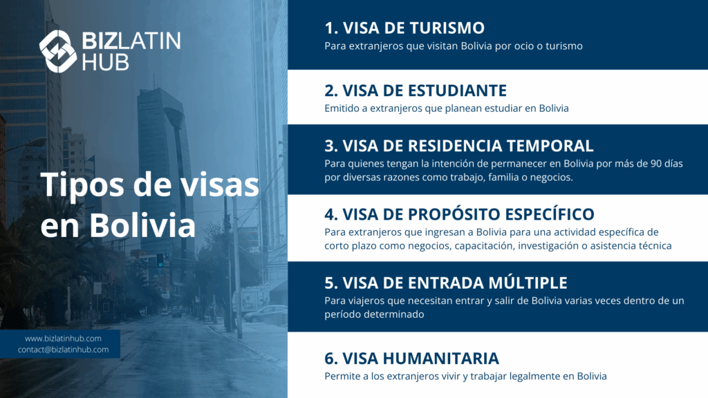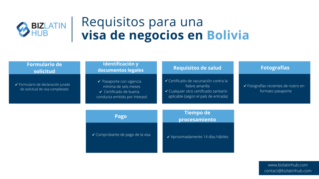 El visado de negocios en Bolivia se denomina técnicamente visado múltiple, que se concederá por un periodo de un año y podrá renovarse por un periodo similar.