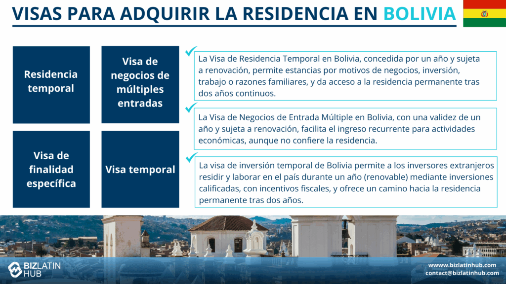 La residencia temporal y permanente también representan opciones alternativas para cualquiera que necesite un visado de negocios en Bolivia