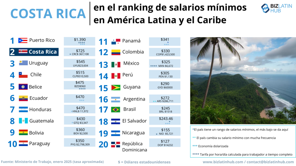¿Cuál es el salario mínimo en Costa Rica? | El salario mínimo vigente en enero de 2025 varía mucho según el sector, de 367.108 CRC$ a 784.139 CRC$ (aprox. 725 USD-1.550 USD). |