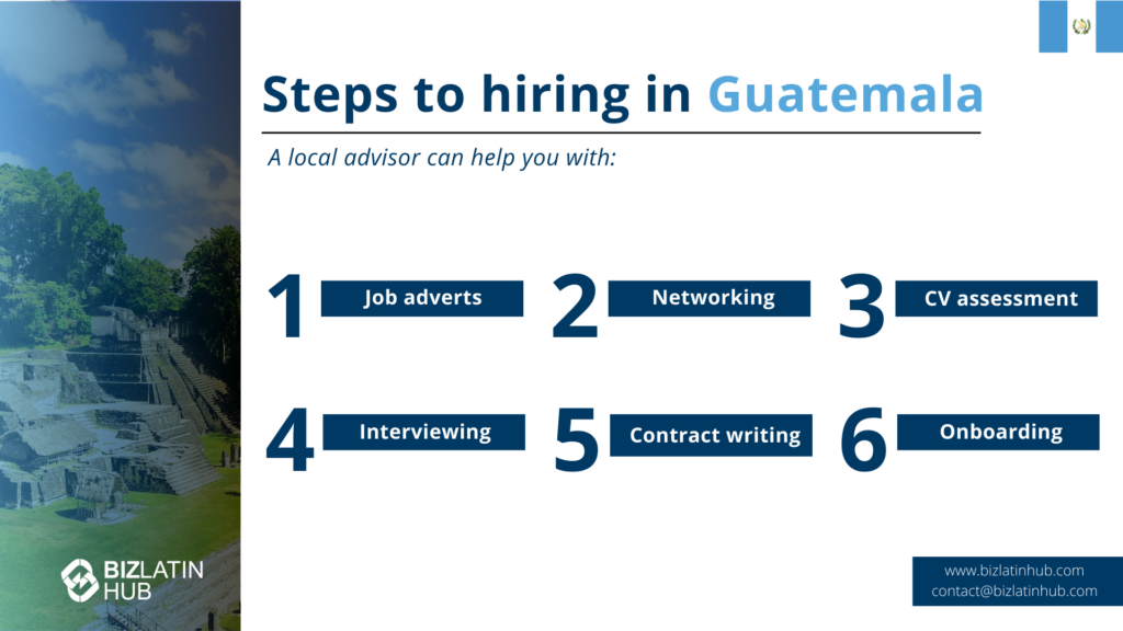 Recruiting employees in Guatemala involves understanding local practices and labor laws. Employers should leverage social networking sites and popular job boards like Opcion Empleo, Computrabajo, Tecoloco, LinkedIn, and Go Abroad. Conducting background checks requires written consent from candidates for accessing non-disclosed information.