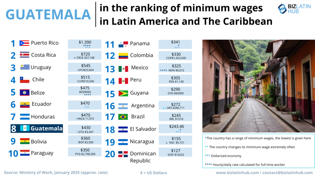 Guatemala has specific minimum wage rates, depending on the industry. The minimum wage ranges from GTQ 3,062.63 to GTQ 3,416.38 per month.