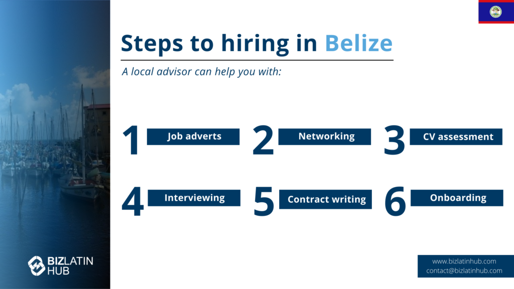 Steps to hiring in Belize | A local advisor can help you with: Job adverts Networking CV assessment Interviewing Contract writing Onboarding |