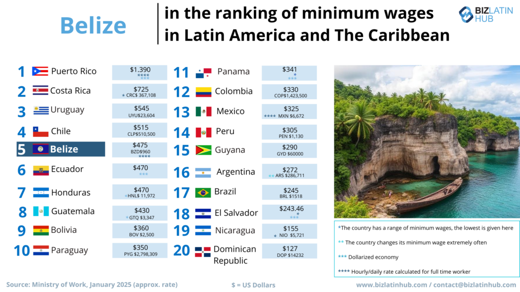 What is the minimum wage in Belize? | The minimum wage in Belize is BZD$5.00 per hour from January 1, 2025. |