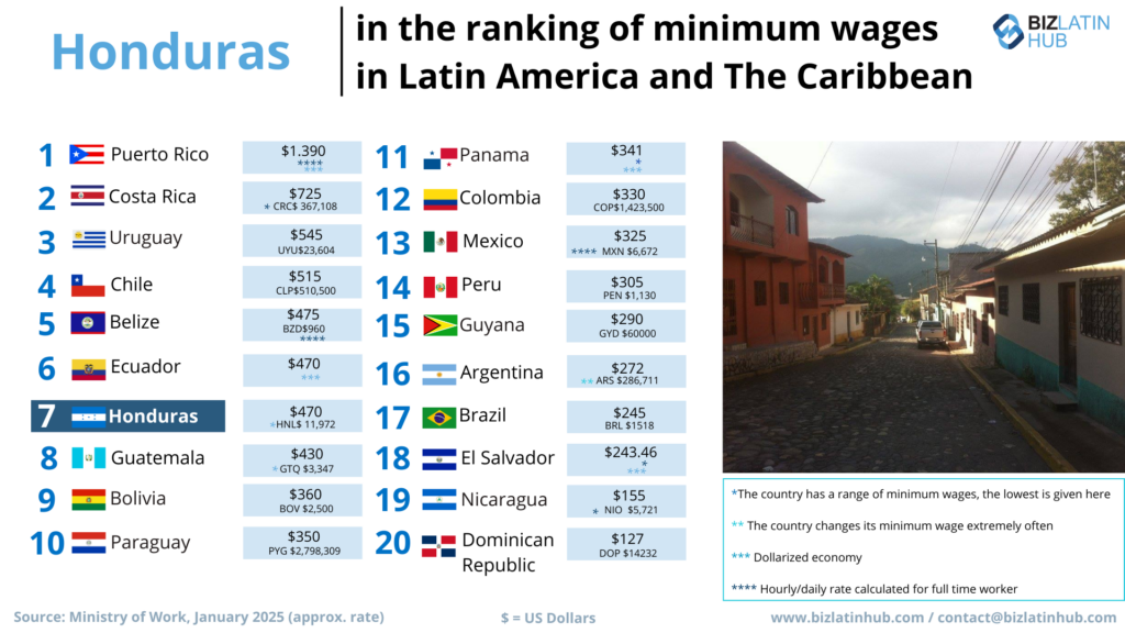 Employers in Honduras face several labor taxes and payroll obligations. They must contribute an extra 9.87% on top of salaries for public health insurance and a housing fund. Additionally, employers pay 13th and 14th salaries, each equal to one month’s salary, in December and July.
