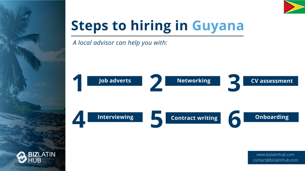 Steps to hiring in Guyana | A local advisor can help you with: Job adverts Networking CV assessment Interviewing Contract writing Onboarding |