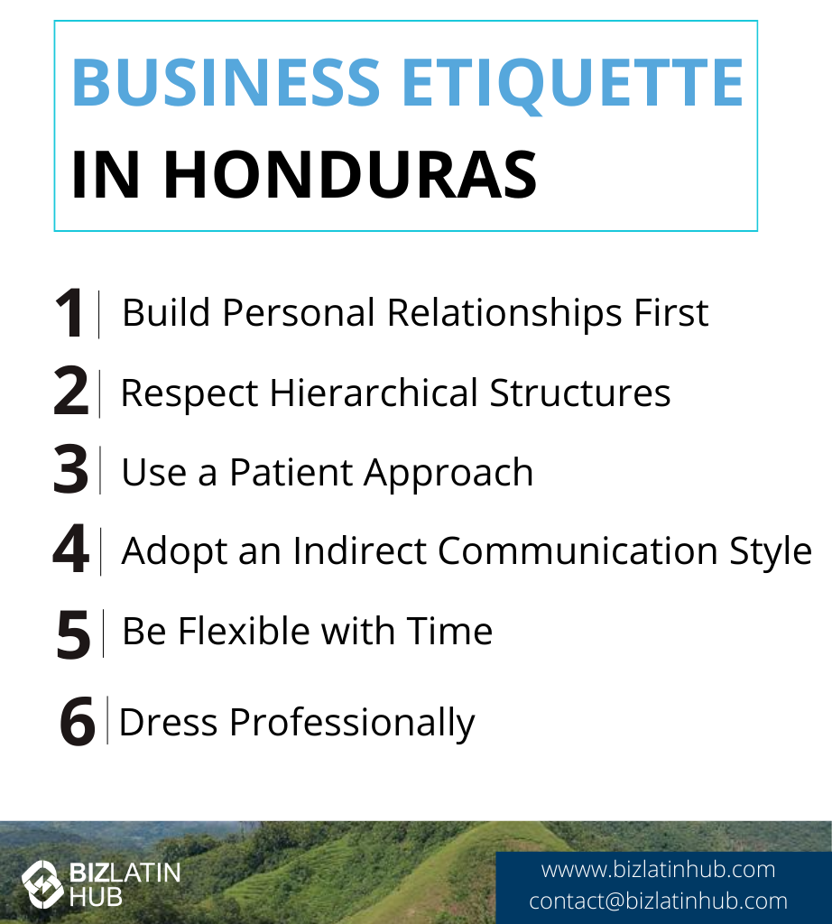 Respect for titles and formal addresses is important in Honduran business culture. This shows respect for hierarchy and authority. Patience is essential in meetings, valuing input for a collaborative environment.