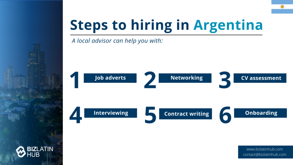 6 steps to hire staff in Argentina | A local advisor can help you with: Step 1: Job adverts Step 2: Networking Step 3: CV assessment Step 4: Interviewing Step 5: Contract writing Step 6: Onboarding |