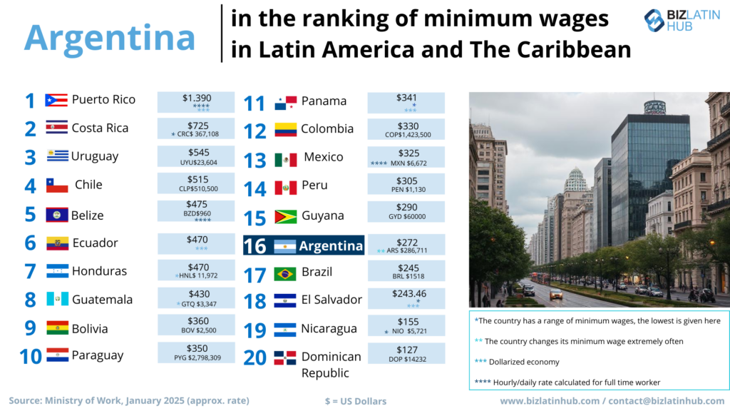 What is the minimum wage in Argentina? | The current minimum wage as of January 2025 is ARS$286,711.00. This frequently changes but usually hovers around USD$300. |