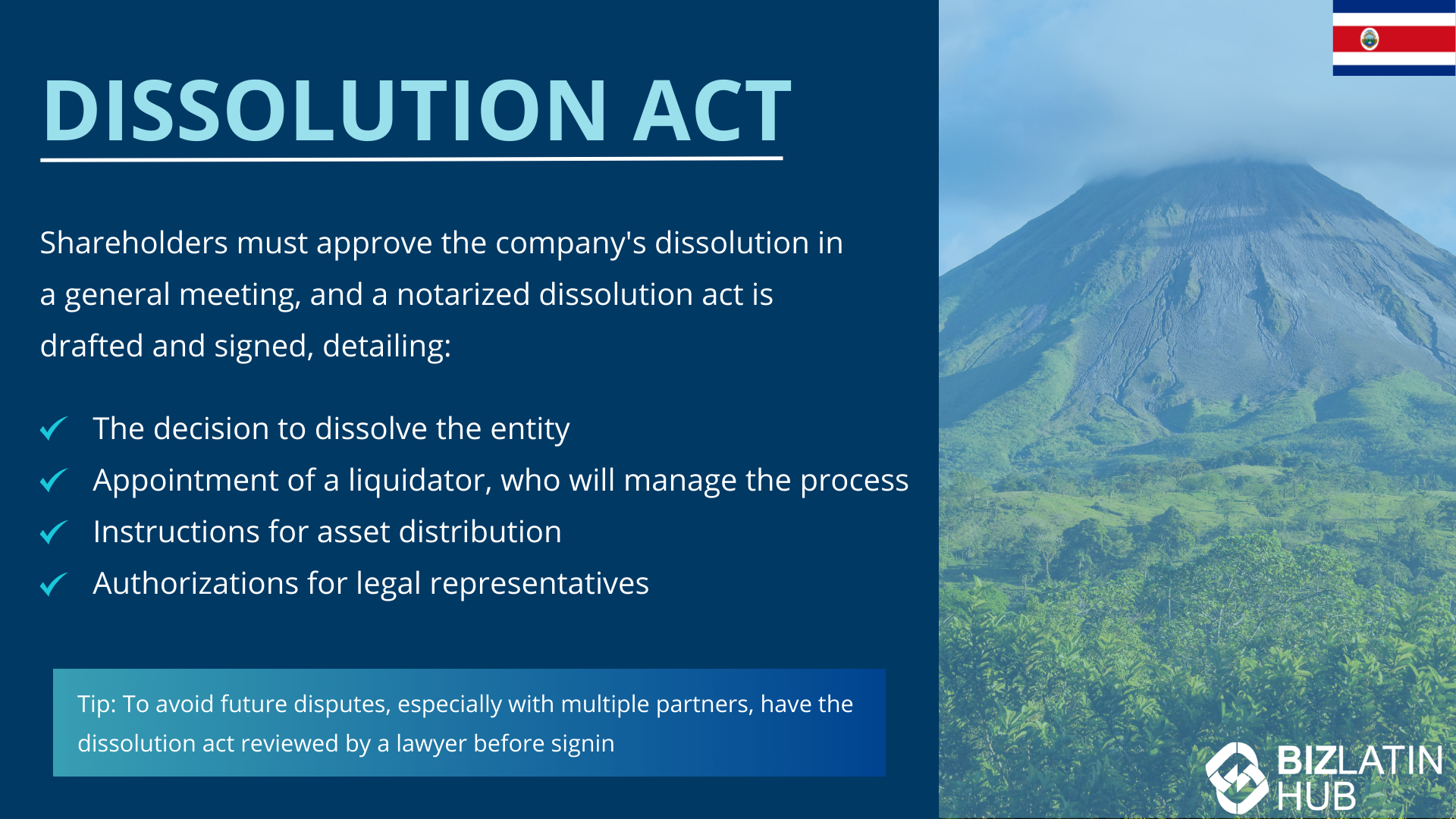 Once any claims and debts have been repaid, it is up to the shareholders to file the dissolution agreement to complete the liquidation of their business in Costa Rica. The terms of the dissolution must outline paid creditors, asset sharing, and all aspects of the liquidation process.