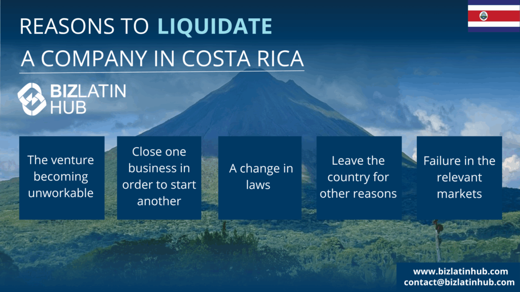 There are a number of reasons you may do so, such as the venture becoming unworkable, a change in laws or simple failure in the relevant markets. You may wish to close one business in order to start another or you may want to leave the country for other reasons. For whatever reason you eventually decide to liquidate a company in Costa Rica, it is best to do so in accordance with the law.