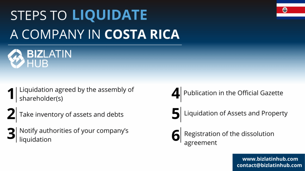 6 steps to liquidate a company in Costa Rica | Step 1 – Liquidation agreed by the assembly of shareholder(s). Step 2 – Take inventory of assets and debts. Step 3 – Notify authorities of your company’s liquidation. Step 4 – Publication in the government gazette. Step 5 – Liquidation of Assets and Property. Step 6 – Registration of the dissolution agreement. |