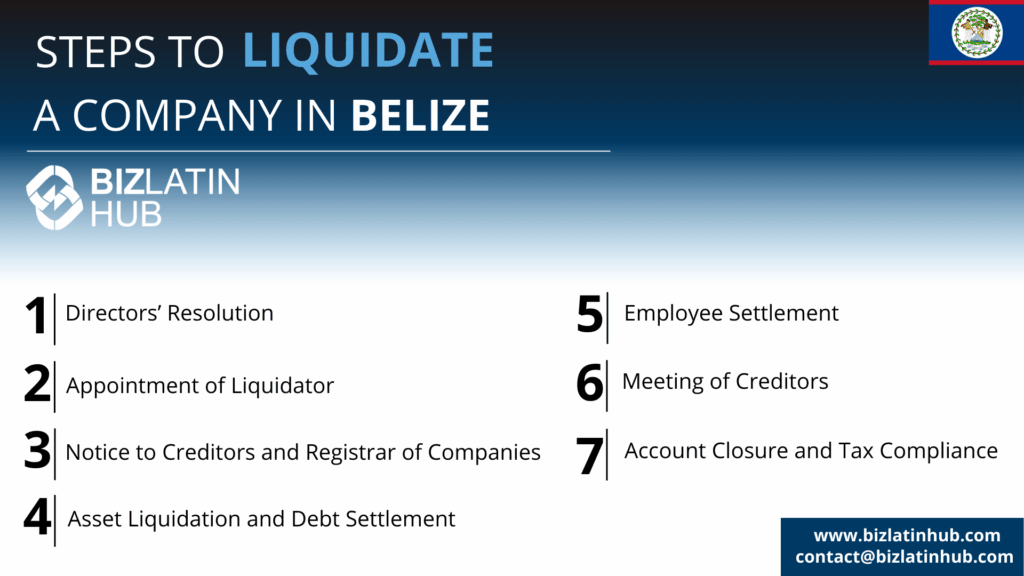 7 Steps to liquidate a company in Belize | Step 1: Create a Plan of Liquidation Step 2: Pass a Shareholder Resolution Step 3: File a Notice with the Registrar Step 4: Appoint a Licensed Liquidator Step 5: Settle Company Affairs Step 6: File Articles of Dissolution |