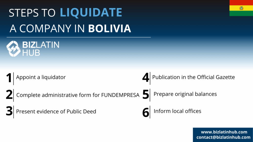 6 steps to liquidate a company in Bolivia | 1. Appoint a liquidator. 2. Complete administrative form for FUNDEMPRESA. 3. Present evidence of Public Deed. 4. Publication in the Official Gazette 5. Prepare original balances. 6. Inform local offices. |