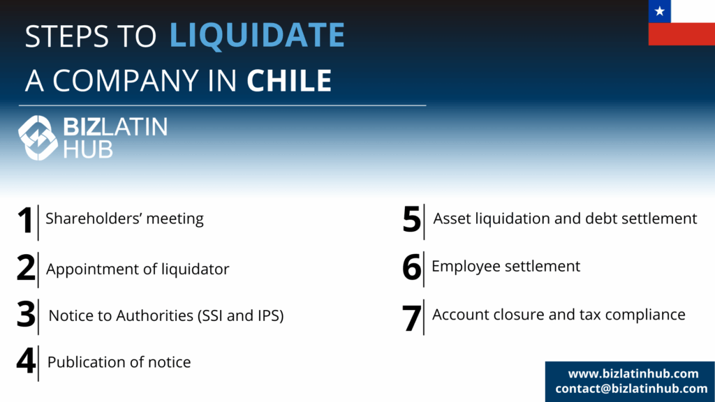 7 steps to liquidate a company in Chile: | 1. Shareholders’ Meeting 2. Appointment of Liquidator 3. Notice to Authorities (SII and IPS) 4. Publication of Notice 5. Asset Liquidation and Debt Settlement 6. Employee Settlement 7. Account Closure and Tax Compliance |