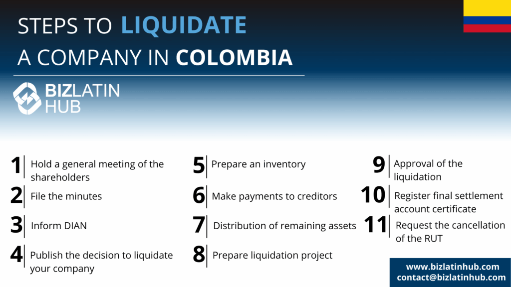 11 Steps to liquidate a company in Colombia | Hold a general meeting of the shareholders. File the minutes. Inform DIAN. Publish the decision to liquidate your company. Prepare an inventory. Make payments to creditors. Distribution of remaining assets. Prepare liquidation project. Approval of the liquidation. Register final settlement account certificate. Request the cancellation of the RUT. |