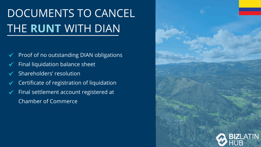 - Tax Compliance: File and settle all outstanding tax returns. DIAN will not cancel the RUT unless the company has zero liabilities.