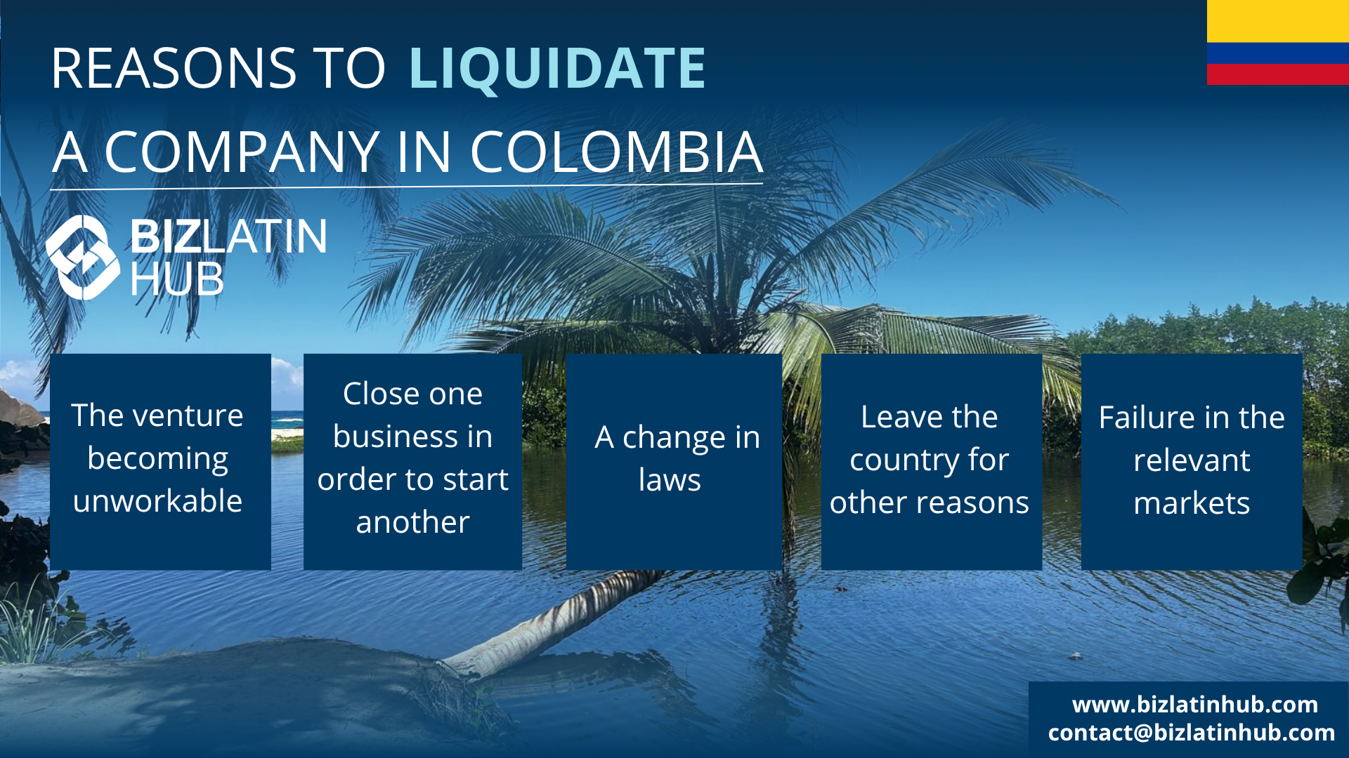 What are the reasons to liquidate a company in Colombia? | These vary, but are usually due to financial insolvency in one way or another. Voluntary liquidation allows you to tie up loose ends in accordance with the law. |