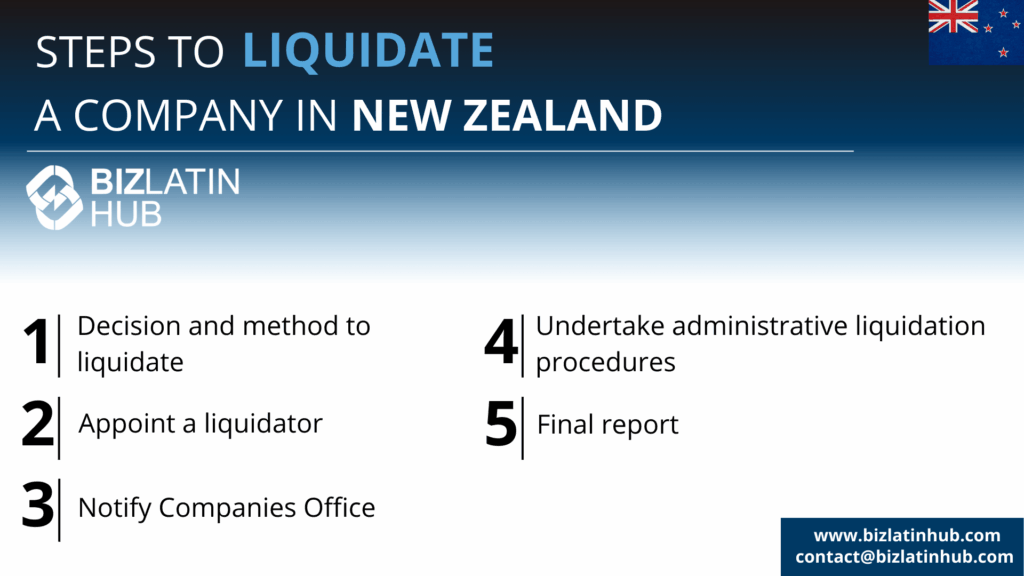 Steps to liquidate a company in New Zealand | 1. Decision and method to liquidate 2. Shareholder resolution 3. Appoint a liquidator 4. Notify Companies Office 5. Undertake administrative liquidation procedures 6. Final report |