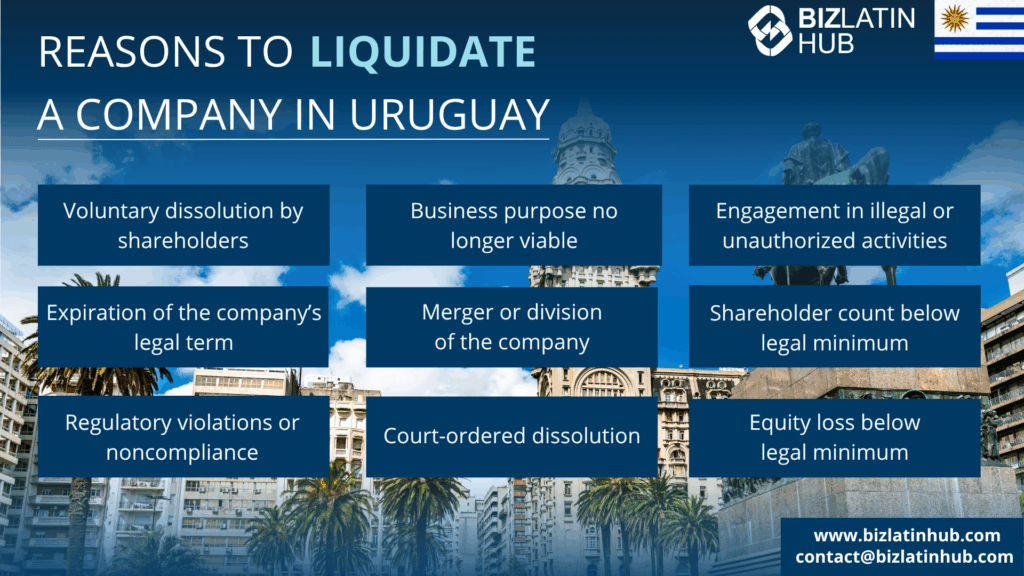 What are the reasons to liquidate a company in Uruguay? | Companies may choose or be required to liquidate for the following reasons: Shareholders’ decision to voluntarily dissolve Expiration of the company’s legal term as stated in its bylaws Regulatory noncompliance or violation of legal obligations Business purpose is no longer viable or achievable Judicial order based on litigation or creditor petition Severe financial losses reducing net equity below one-quarter of the capital Corporate merger or division Reduction of shareholders below minimum legal requirements Involvement in illegal or unauthorized activities |