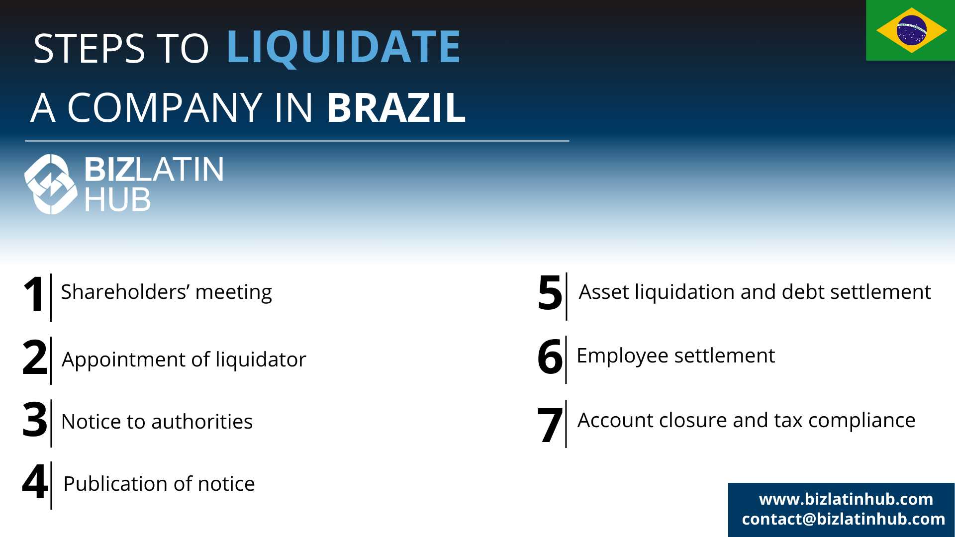 7 steps to liquidate a company in Brazil | Shareholders’ meeting Appointment of liquidator Notice to authorities Publication of notice Asset liquidation and debt settlement Employee settlement Account closure and tax compliance |