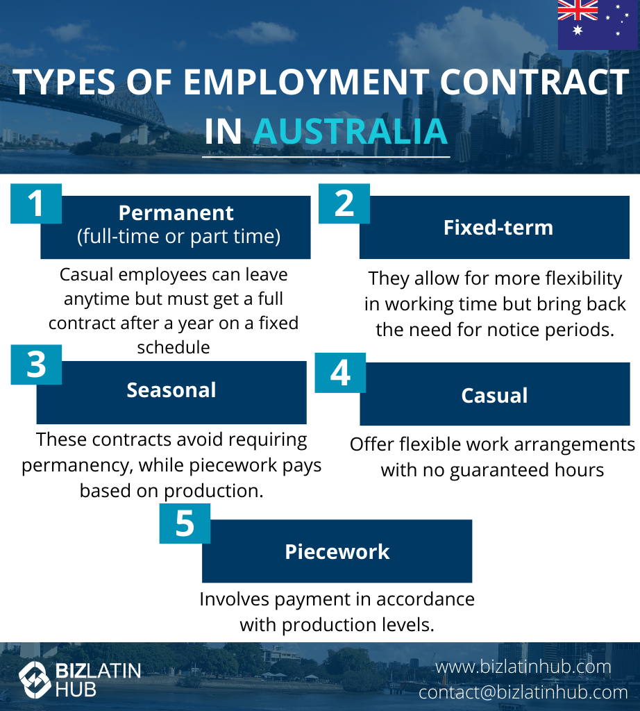 Types of Employment Contracts in Australia | Permanent (full-time or part time) Casual Fixed-term Seasonal Piecework |