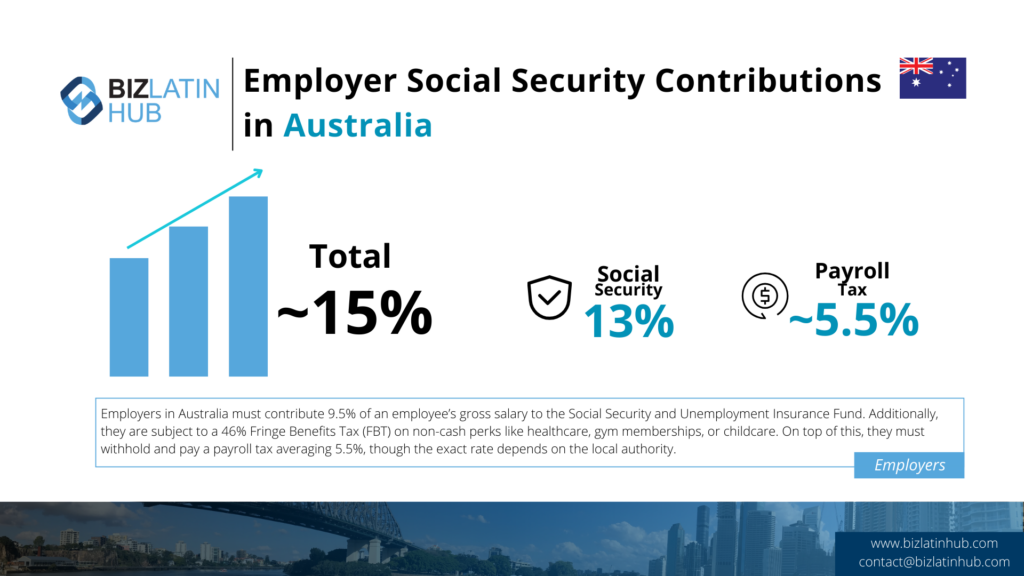 What percentage of an employee’s salary is contributed to social security in Australia? | Employers must pay into the Social Security and Unemployment Insurance Fund at a rate of 9.5% of an employees’ gross salary. Employers are also expected to withhold payroll tax that is due on all employees’ wages, which averages at around 5.5%. |