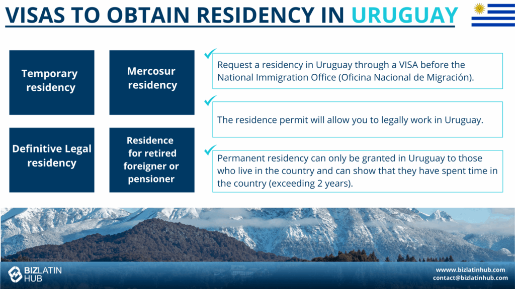 To obtain residency in Uruguay through a VISA is an administrative process that is performed before the National Immigration Office (Oficina Nacional de Migración) when a foreigner wishes to reside temporarily or permanently in Uruguay. The process is different – it is more agile- especially if you’re a member of Mercosur.
