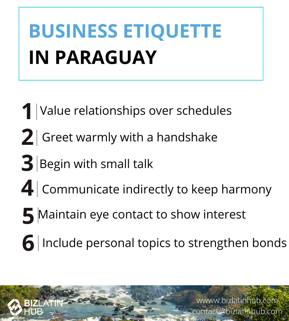 Meeting rules and being on time are significant in Paraguay. First greetings influence business interactions. Patience and respect for the culture build trust.