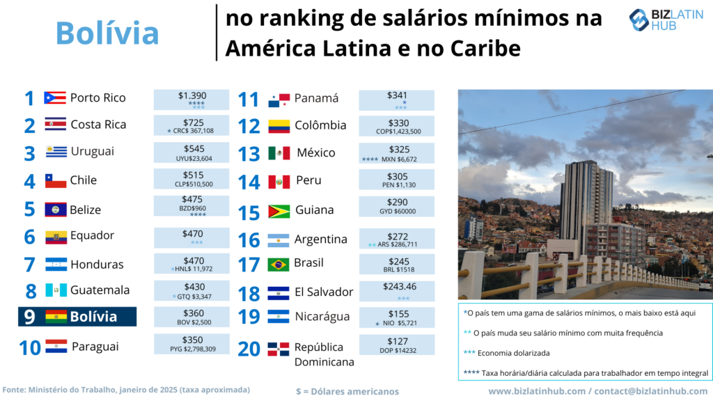 Salário mínimo na Bolívia | O salário mínimo boliviano para 2025 é de Bs$ 2.500 (cerca de USD$ 360) por mês, aplicável a partir de 17 de janeiro. |